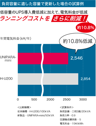 UPS更新の際に、負荷設備の電源容量に見合った、より小規模のUPSを選定することで、さらに、更新費用とランニングコストの低減の可能性があります。